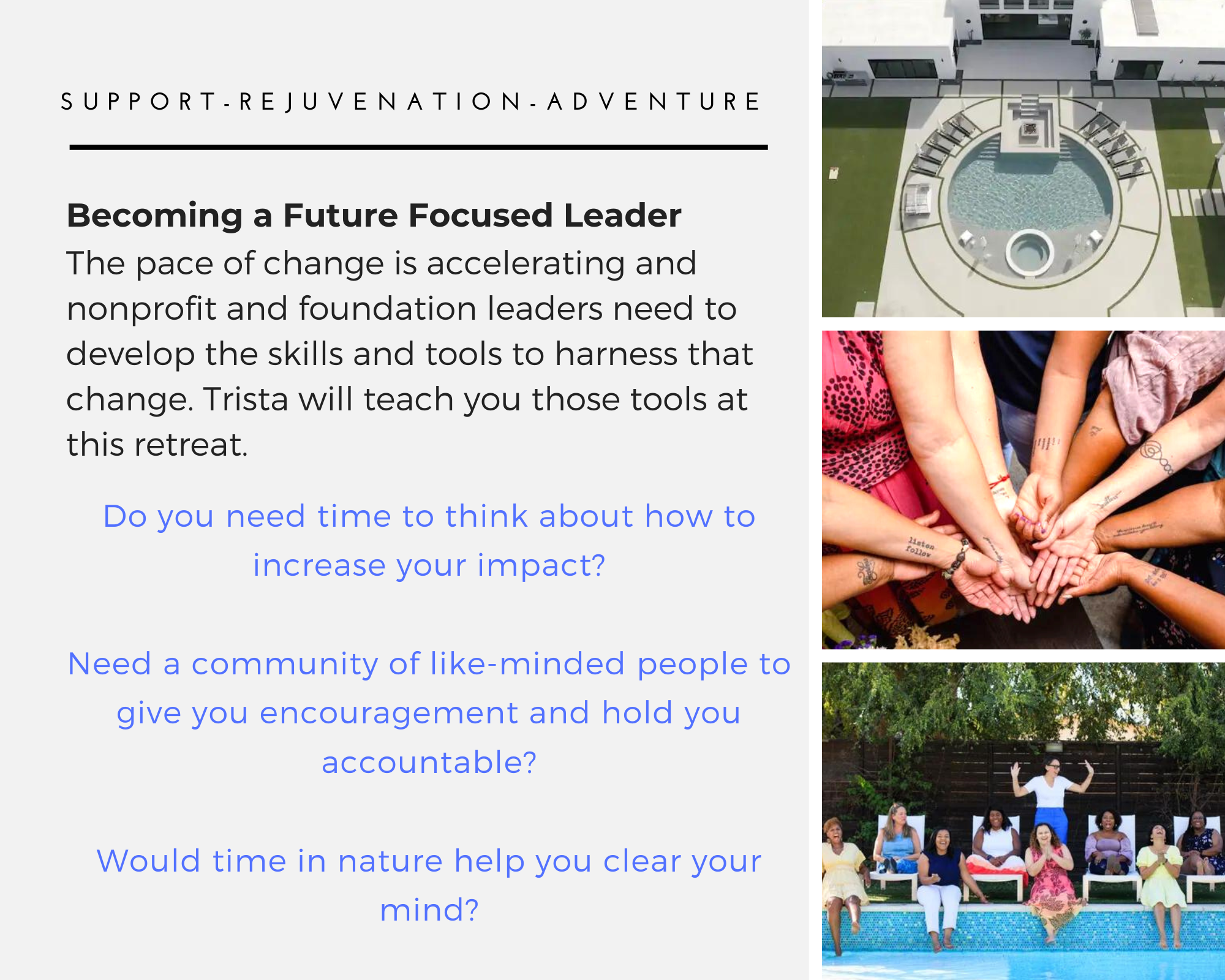 FutureGood takes your safety seriously. We follow local and national guidance for gatherings and keep our retreats purposefully small.